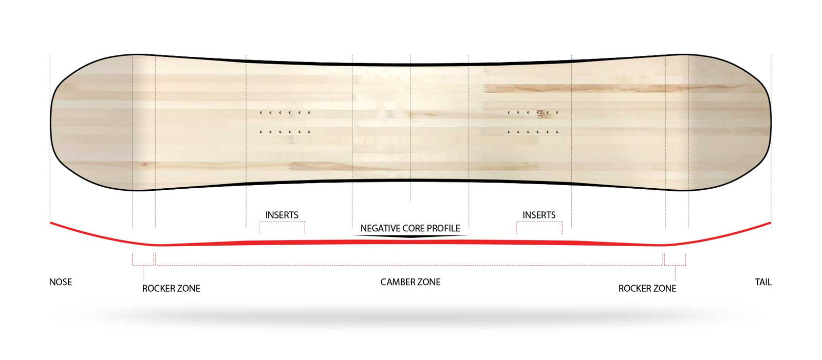 The Dirft Series comes with a negative core profile. We remove some of the wood core between the bindings to help balance the flex from tip to tail. The board feels more playful and adds foot control on all terrain.